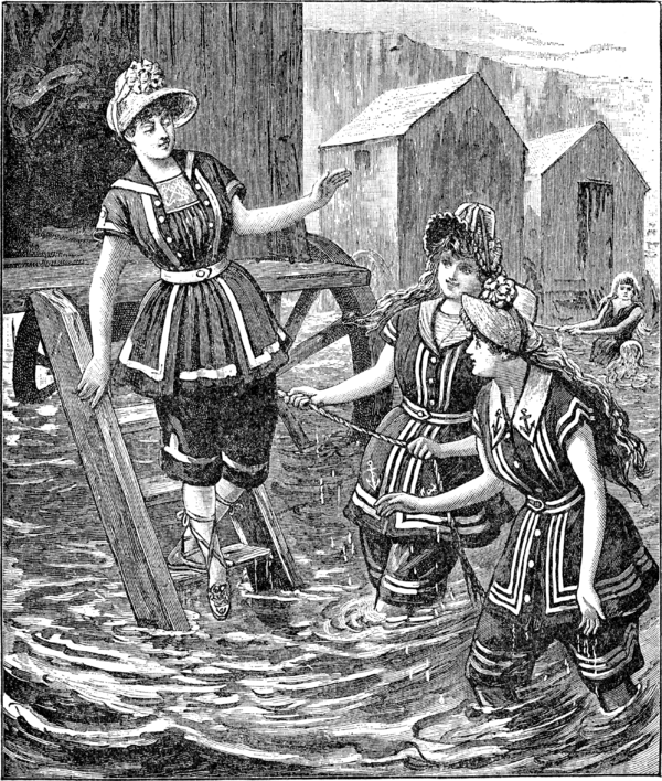 Оригинальный текст (англ.)[показатьскрыть]Our women must go through considerable trouble before they are ready for a dip, and to yet more trouble before they are again presentable after the bath. These facts are quite sufficient to keep many from the water, and in addition they have costumes to wear which effectively prevent the popularizing of the best possible swimming.