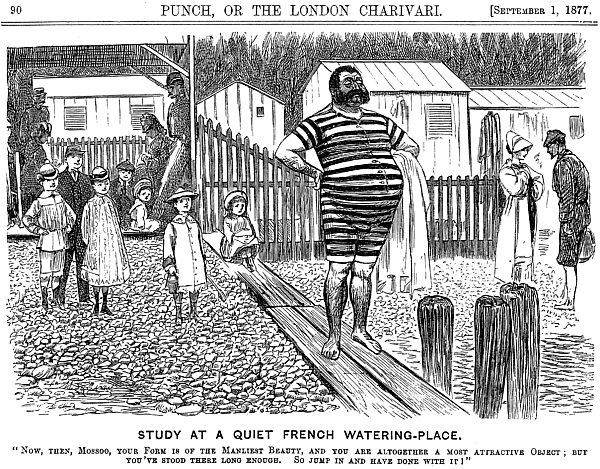 Однако в 1860 году купаться обнажённым стало запрещено законом. Примерно в то же время, в середине XIX века, стали появляться первые мужские купальные костюмы[46]. Они представляли собой закрывавшие большую часть тела трико или комбинацию из майки и шорт. Зачастую, ввиду влияния морского стиля, они были полосатыми[46], также были модели чёрного цвета[47]. Рукава купальников были короткими, штанины доходили до колен. Плотно облегавшие тело купальники хорошо подходили подтянутым мужчинам[48]. Также, начиная с 1860-х годов, существовали и плавки (англ. bathing/swimming trunks/drawers, calecons) в виде шорт, завязывавшиеся на талии[49], и надевавшиеся непосредственно для плавания, появляться в них на пляже было неприличным[50], в отличие от, например, пресных водоёмов или мужских купален[18]. Так, тот же Килверт, в своей дневниковой записи за за 12 июня 1873 года, вспоминает, что будучи в городе Шанклин на юге острова Уайт, он, был вынужден принять «отвратительный обычай купаться в подштанниках» (англ. detestable custom of bathing in drawers) был вынужден всё-таки одеть плавки. Однако бурные морские волны порвали плавки и стянули их до лодыжек. Выброшенный волнами поближе к берегу, Килверт снял плавки (названные «мерзкой тряпкой» (англ. wretched and dangerous rag)) и вышел на берег уже голым. В той же записи Килверт пишет: «Если женщинам не хочется видеть обнаженного мужчину в море, так пусть они и не смотрят» (англ. If ladies don't like to see men naked why don't they keep away from the sight?)[51][52]. В другой записи, за 24 июля того же года, Килверт описывает, что будучи в городе Ситон (графство Девон) попал в неловкую ситуацию: когда он был в купальном фургоне, мальчик-служка поднёс ему полотенце и плавки в красно-белую полоску (англ. very short red and white striped drawers), которые он, по невежеству, не одел, и вошёл в воду голым. Уже выходя на берег, Килверт заметил, что небольшая группа из нескольких мальчишек с глумливым интересом стала рассматривать его, «невоспитанного голого дядьку» (англ. rude naked man), однако проходившие мимо него две молодые леди, «казалось, не имели никаких возражений» (англ. seemed to have no objection)[51][53]. Вообще Килверт, к своему собственному удовольствию, и к ужасу публики, купался в море дважды в день, отказываясь надевать купальник. Писатель и карикатурист Жорж дю Морье, француз по национальности, работавший в сатирическом журнале «Punch», зафиксировал так и закрытый купальник-трико (приведённая выше карикатура «Study at a Quiet French Watering Place» 1877 года, изображающего отдыхающего во Франции англичанина, к которому обращаются прохожие: «О да, мсье, вы тут, бесспорно, самый красивый. Но хватит уже изучать местность, ныряйте!» (англ. Now, then, mossoo, your form is of the manliest beauty, and you are altogether a most attractive object; but you've stood there long enough. So jump in and have done with it!)[18]), так и плавки (карикатура «Awkward» 1870 года, изображающего престарелого джентльмена-толстяка, случайно заплывшего к женщине у купального фургона[18]). Подобный вид мужской купальный костюм сохранял очень долго[46].