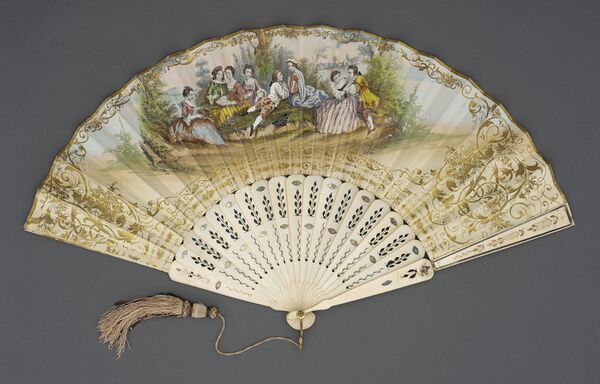 - Веера изготавливались из различных материалов: кружево, ткань, перья, бумага, костяные пластинки и так далее. Бумажные веера с росписью красками или литографиями стали широко доступны с 1840-х годов, когда началось их массовое производство. В середине века в моду входят веера в виде опахала, подражающие восточным — индийским, китайским, японским — мотивам.