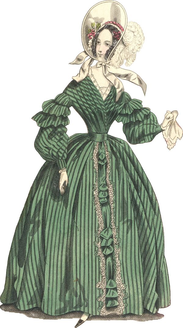 В начале правления королевы Виктории в моде царила эстетика романтизма. Этот стиль требовал тонкой и несколько заниженной талии. Для достижения нужного эффекта использовался специальный корсет, который шнуровался до самых бедер. Постепенно, прежде огромные рукава становятся менее массивными и укорачиваются, плечи сужаются, а юбка-колокол удлиняется и стремительно набирает в объёме: под верхнюю ткань надевали множество слоев накрахмаленных нижних юбок, которые должны были поддерживать форму платья.