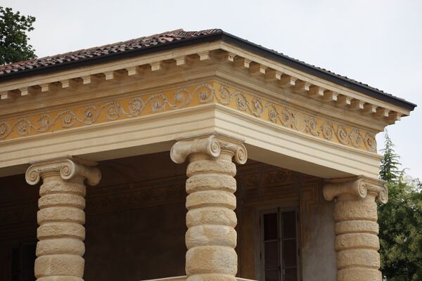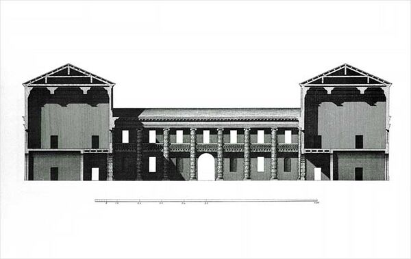«П»-образная колоннада, пересечённая балконами, образована мощными рустованными колоннами «сельского стиля» (из карьеров известняка Серегосы, расположенных поблизости). Палладио назвал их выполненными из «невежливого» (non polite) камня. Подобная маньеристская выдумка сродни традиционной сельской архитектуре Вероны. Такие колонны уникальны в творчестве Палладио, но перекликаются с воротами на вилле Триссино (Меледо-Сарего).