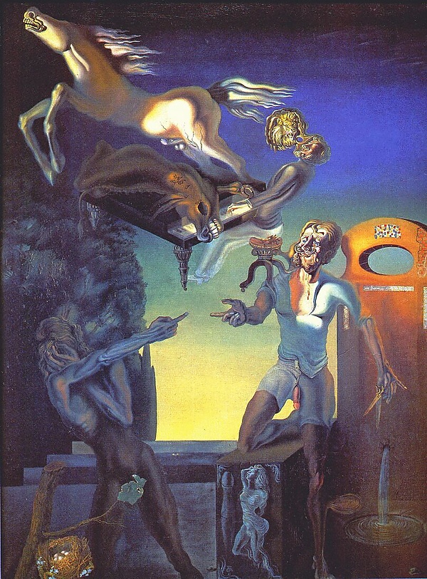 У двух фигур на картине (самого Вильгельма и летающего коня) выставлены напоказ гениталии. Обе фигуры изображают властного отца. Застывшая в отчаянии фигура, закрывшая лицо рукой, — подавленный сын, возможно, оскоплённый (о чём говорят и ножницы в руках Вильгельма Телля). Отца выдаёт страдальческое выражение лица, а невнушительное телосложение и беспомощно повисший фаллос говорят о слабости, которая кроется за его дутой властью. Дали аллегорически изобразил своё изгнание из дома, случившееся за год до написания картины. В этом изгнании — суть «оскопления», лишения родных мест, вдохновлявших художника своими пейзажами. Безжалостное решение стоит усилий и страданий самому отцу. Но в то же время он торжествует, ощущая себя мужчиной. Он же изображён выше, играющим на рояле. А мощный конь-самец и мёртвый осёл — это его, отца представление о себе и о побеждённом упрямце-сыне соответственно. Образ отца давит на сына, попирает его мужское достоинство, мешает повзрослеть и реализоваться.