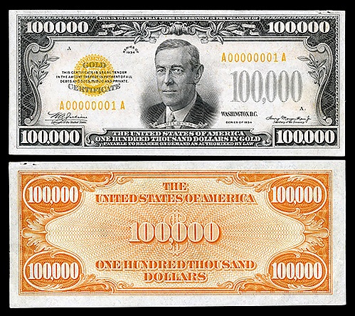 Вудро Вильсон изображён на купюре с номиналом в 100 тыс. долларов, самой крупной в истории страны[13].