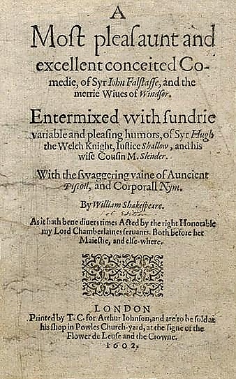 Пьеса была внесена в «Регистр Гильдии книгопечатников и издателей» 18 января 1602 г.; впервые опубликована в 1602 году со значительными искажениями текста и под названием «Чрезвычайно занятная и весьма остроумная комедия о сэре Джоне Фальстафе и виндзорских насмешницах. Содержащая разные забавные выходки уэльского рыцаря сэра Хью, судьи Шеллоу и его премудрого племянника мистера Слендера. С пустым хвастовством прапорщика Пистоля и капрала Нима. Сочинение Уильяма Шекспира. Как она не раз исполнялась слугами достопочтенного лорда-камергера и в присутствии её величества, и в других местах»[1]. Вторая публикация (также кварто) относится к 1619 году, это издание воспроизводит все ошибки первого. Текст пьесы без искажений и пропусков был напечатан только в 1623 году (фолио).