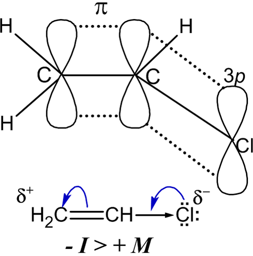 Смещение электронной плотности в молекуле винилхлорида от атома хлора в сторону двойной связи, благодаря эффекту сопряжения (+M-эффект), действует одновременно с сильным электроноакцепторным индуктивным эффектом атома хлора (−I-эффект), однако влияние последнего сильнее (−I > +M), поэтому галоген несёт на себе небольшой отрицательный заряд (см. рисунок)[18].