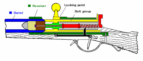 При спуске курка игла, составляющая часть замка, прокалывала заряд, лепёшку ударного состава, отчего последняя воспламенялась — происходил выстрел; при этом шпигель пороховыми газами вжимался в нарезы ствола и, обжимая пулю, заставлял её принимать участие в своём вращении по нарезам. Впоследствии была применена пуля системы Минье (расширительного типа с железной чашечкой).