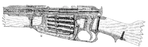Во-вторых, что ещё важнее, после опустошения магазина требовалось его весьма длительное наполнение, осуществлявшееся в тогдашних конструкциях по одному патрону, чем существенно снижалась практическая скорострельность. Это делало проблематичным использование ранних магазинных винтовок в полевых сражениях, — хотя в определённых ситуациях, например, при обороне укреплённых позиций, когда стрелок имел возможность относительно спокойно перезарядить своё оружие, они, безусловно, имели большие преимущества.