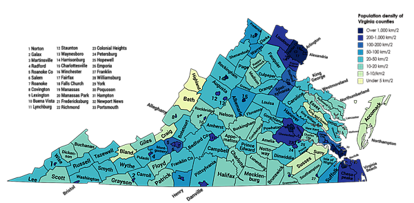 Столица — Ричмонд, крупнейший город — Верджиния-Бич, другие крупные города — Александрия, Линчберг, Норфолк, Ньюпорт-Ньюс, Портсмут, Роанок, Хамптон, Чесапик. Административно Виргиния разделена на 95 округов и 38 «независимых городов», которые не входят ни в один округ и представляют собой полностью самостоятельные административно-территориальные единицы второго уровня[8][9].
