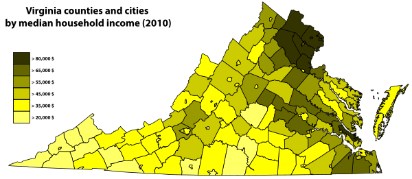 В Виргинии средний доход семьи составляет 72 600 долларов США, что соответствует 11-му месту по величине в стране, а уровень бедности составляет 10,7 %, по которому штат занимает 12-ое среди самых низких уровней по стране по состоянию на 2018 год. В округе Монтгомери за пределами Блэксберга самый высокий уровень бедности в штате: 28,5 % ниже минимального уровня порога бедности, согласно переписи населения США. В то же время в округе Лаудон — самый высокий средний доход среди семей в стране, а более крупный регион Северная Виргиния входит в число регионов с самым высоким уровнем доходов по всей стране[225]. По состоянию на 2013 год шесть из двадцати округов США с самыми высокими доходами[226], включая два самых высоких и три из пятидесяти городов с самыми высокими доходами, расположены в Северной Виргинии[227]. Хотя индекс Джини показывает, что в Виргинии экономическое неравенство меньше, чем в среднем по стране[228], численность среднего класса штата также меньше, чем в большинстве штатов[229].