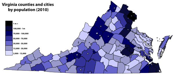 Более 3,1 миллиона человек, 36 % жителей Виргинии, проживает в Северной Виргинии, которая является частью более крупной Вашингтонской агломерации и Северо-восточной агломерации[161]. Округ Фэрфакс — самый густонаселённый округ в штате, с населением более 1,1 миллиона человек, хотя это число не включает в себя жителей окружного центра Фэрфакс, который является одним из независимых городов[162]. В округе Фэрфакс есть крупный городской деловой и торговый центр в Тайсонс-Корнер, который является крупнейшим офисным рынком Виргинии[163]. Соседний округ Принс-Уильям является вторым по численности населения округом Виргинии с населением более 450 000 человек. Здесь находится база морской пехоты Куантико, Академия ФБР и национальный парк «Поле битвы при Манассасе». Округ Лаудон с центром в Лисберге является самым быстрорастущим округом в штате[162][164]. Округ Арлингтон является самым маленьким самоуправляющимся округом в США по площади суши[165], его власти рассматривают возможность реорганизации в качестве независимого города из-за высокой плотности населения округа[159].
