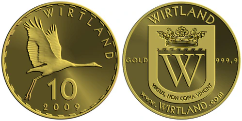 В июле 2009 года Виртландия начала выпуск своей первой золотой монеты, известной как «Виртландский журавль» («Wirtland Crane»)[14]. Монета весом 1/10 тройской унции отчеканена из чистого золота[15]. «Wirtland Crane» считается первой золотой монетой, выпускающейся виртуальным государством[16].