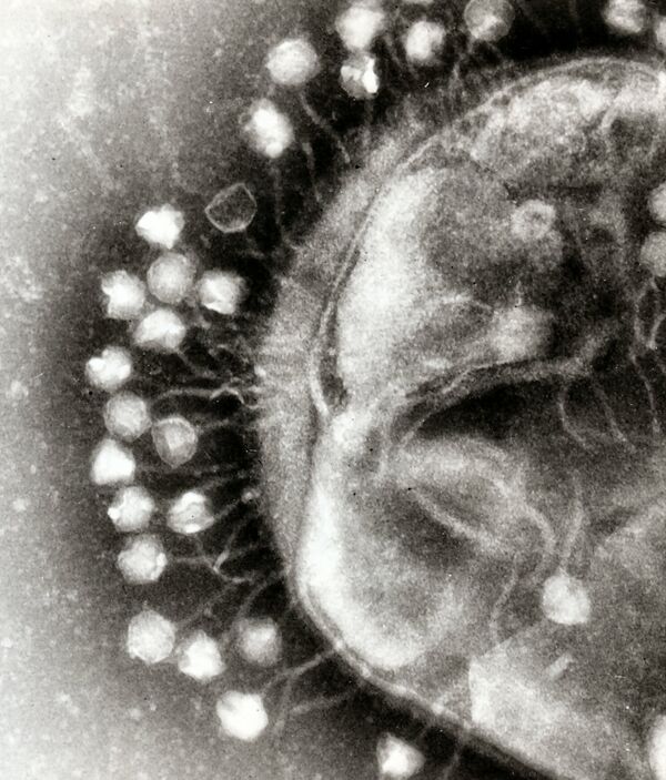 Бактериофаги представляют собой широко распространённую и разнообразную группу вирусов, достигающую большей численности в водных средах обитания — в океанах этих вирусов более чем в 10 раз больше, чем бактерий[233], достигая численности в 250 млн. вирусов на миллилитр морской воды[234]. Эти вирусы поражают специфичные для каждой группы бактерии, связываясь с клеточными рецепторами на поверхности клетки и затем проникая внутрь неё. В течение короткого промежутка времени (иногда считанных минут) бактериальная полимераза начинает транслировать вирусную мРНК в белки. Эти белки или входят в состав вирионов, собираемых внутри клетки, или являются вспомогательными белками, помогающими сборке новых вирионов, или вызывают лизис клетки. Вирусные ферменты вызывают разрушение клеточной мембраны, и, в случае фага Т4, всего лишь через 20 минут после проникновения в клетку на свет появляются свыше трёх сотен бактериофагов[235].