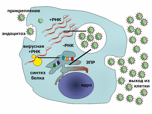 - Проникновение в клетку. На следующем этапе вирусу необходимо доставить внутрь клетки свой генетический материал. Некоторые вирусы также переносят внутрь клетки собственные белки, необходимые для её реализации (особенно это характерно для вирусов, содержащих негативные РНК). Различные вирусы для проникновения в клетку используют разные стратегии: например, пикорнавирусы впрыскивают свою РНК через плазматическую мембрану, а вирионы ортомиксовирусов захватываются клеткой в ходе эндоцитоза и попадают в кислую среду лизосом, где происходит депротеинизация вирусной частицы, после чего РНК в комплексе с вирусными белками преодолевает лизосомальную мембрану и попадает в цитоплазму. Вирусы также различают по тому, где происходит их репликация: часть вирусов (например, те же пикорнавирусы) размножается в цитоплазме клетки, а часть (например, ортомиксовирусы) в её ядре. Процесс инфицирования вирусами клеток грибов и растений отличается от инфицирования клеток животных. Растения имеют прочную клеточную стенку, состоящую из целлюлозы, а грибы — из хитина, так что большинство вирусов могут проникнуть в них только после повреждения клеточной стенки[101]. Однако почти все вирусы растений (включая вирус табачной мозаики) могут перемещаться из клетки в клетку в форме одноцепочечных нуклеопротеиновых комплексов через плазмодесмы[102]. Бактерии, как и растения, имеют крепкую клеточную стенку, которую вирусу, чтобы попасть внутрь, приходится повредить. Но в связи с тем, что клеточная стенка бактерий намного тоньше таковой у растений, некоторые вирусы выработали механизм впрыскивания генома в бактериальную клетку через толщу клеточной стенки, при котором капсид остаётся снаружи[103].
