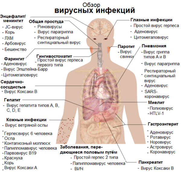 Вирусы распространяются многими способами: вирусы растений часто передаются от растения к растению насекомыми, питающимися растительными соками, к примеру, тлями; вирусы животных могут распространяться кровососущими насекомыми, такие организмы известны как переносчики. Вирус гриппа распространяется воздушно-капельным путём при кашле и чихании. Норовирус и ротавирус, обычно вызывающие вирусные гастроэнтериты, передаются фекально-оральным путём при контакте с заражённой пищей или водой. ВИЧ является одним из нескольких вирусов, передающихся половым путём и при переливании заражённой крови. Каждый вирус имеет определённую специфичность к хозяевам, определяющуюся типами клеток, которые он может инфицировать. Круг хозяев может быть узок или, если вирус поражает многие виды, широк[127].