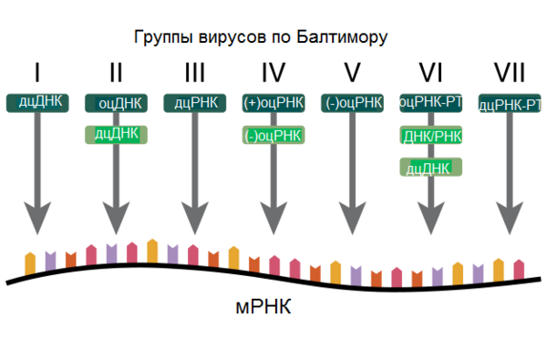 Классификация вирусов по Балтимору основывается на механизме образования мРНК. Вирусы синтезируют мРНК из собственного генома для образования белков и репликации своей нуклеиновой кислоты, однако каждое семейство вирусов имеет собственный механизм этого процесса. Вирусные геномы могут быть одноцепоченые (оц) или двухцепочечные (дц), ДНК- или РНК-содержащие, могут использовать или не использовать обратную транскриптазу. Кроме того, одноцепочечные РНК-вирусы в составе своего генома могут иметь положительную (+) или отрицательную (-) цепь РНК.