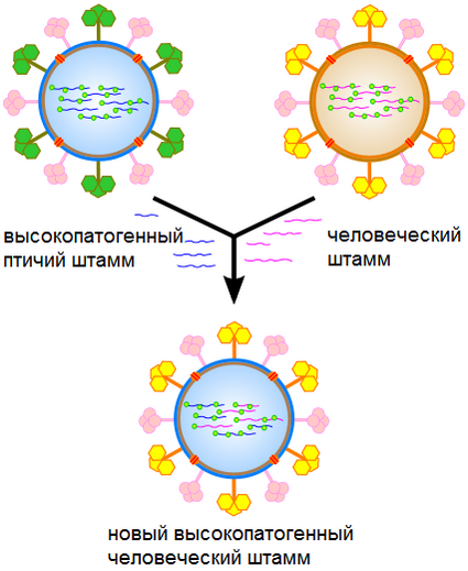 Сегментированный геном даёт эволюционные преимущества: различные штаммы вируса с сегментированным геномом могут обмениваться генами и производить потомков с уникальными характеристиками. Это явление называется реассортиментом[96].
