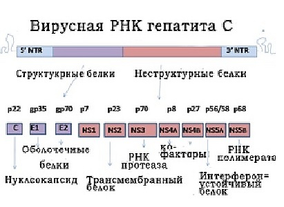 Геном вируса представлен однонитевой линейной (+)РНК размером около 9400 нуклеотидов, которая способна выполнять функцию как мРНК, так и служить матрицей для синтеза дочерних копий вирусного генома.[14] В геноме содержится всего один ген, который кодирует 9 различных белков. Изначально РНК вируса гепатита С транслируется с образованием полипептида длиной около 3000 аминокислот. В геноме вируса содержится два некодирующих региона и одна большая открытая рамка считывания, кодирующая структурные и неструктурные белки. Гены, кодирующие структурные белки, расположены в области 5'-конца цепочки РНК, а неструктурные — в области 3'-конца. К структурным белкам относятся core, Е1 и Е2 белки. Сore-белок является белком нуклеокапсида, он обладает РНК-связывающей активностью, модулирует транскрипцию и трансляцию некоторых клеточных генов и обладает онкогенным потенциалом. Именно с core-белком связывают выраженность прямого цитопатического эффекта вируса гепатита С. Е1 и Е2 белки — гликопротеины внешней оболочки вируса высоковариабельны, а их С-концевые части гидрофобны и могут принимать участие во взаимодействии с клеточной мембраной. В структурной зоне кодируется также пептид р7, играющий важную роль в высвобождении вириона из инфицированной клетки. Неструктурная область вирусного генома кодирует 6 белков — NS2, NS3, NS4A, NS4B, NS5A и NS5B. Функции NS2 и NS4 предположительно связывают с клеточной мембраной. Кроме того, белок NS2 является вирусной цинк-зависимой протеиназой и вместе с клеточными пептидазами участвует в аутокаталитическом нарезании самого себя из вирусного полипротеина. Белок NS3 — это вирусная протеиназа, играющая важную роль в процессинге вирусных белков. Белок NS4A действует как эффектор или кофактор для NS3, он регулирует фосфорилирование белка NS5A, который обладает функцией репликазы. Имеется ряд доказательств, что от NS5A зависит резистентность к IFN-α, так как в нём выделен регион, участвующий в ингибировании индуцируемой IFN-α протеинкиназы. Белок NS5B является вирусной РНК-зависимой РНК-полимеразой. Согласно современным представлениям, в инфицированной клетке белки NS4A, NS4B, NS5A и NS5B вместе с белком NS3 ассоциируются в некую структуру, которая играет важную роль в вирусной репликации. Высокая консервативность 5′- и 3′- некодирующих регионов и их важная роль в репликации вируса делают их перспективными мишенями для разработки средств лечения и профилактики вирусного гепатита С.