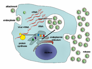 На геномной РНК вируса, выступающей в качестве матрицы для воспроизведения, происходит и синтез дочерних копий вирусного генома при участии специфической вирусной РНК-полимеразы, образующейся в результате расщепления полипротеина. Благодаря этому геномная РНК вируса гепатита С обладает самостоятельной инфицирующей способностью (она способна инфицировать клетки даже попадая в них в «голом виде», то есть не в составе зрелых вирионов), что впрочем, характерно для всех вирусов класса IV классификации Балтимора. Дочерние копии вирусного генома, в свою очередь, могут выступать как в роли мРНК, так и входить в состав новых вирионов, продуцируемых инфицированными клетками[16].