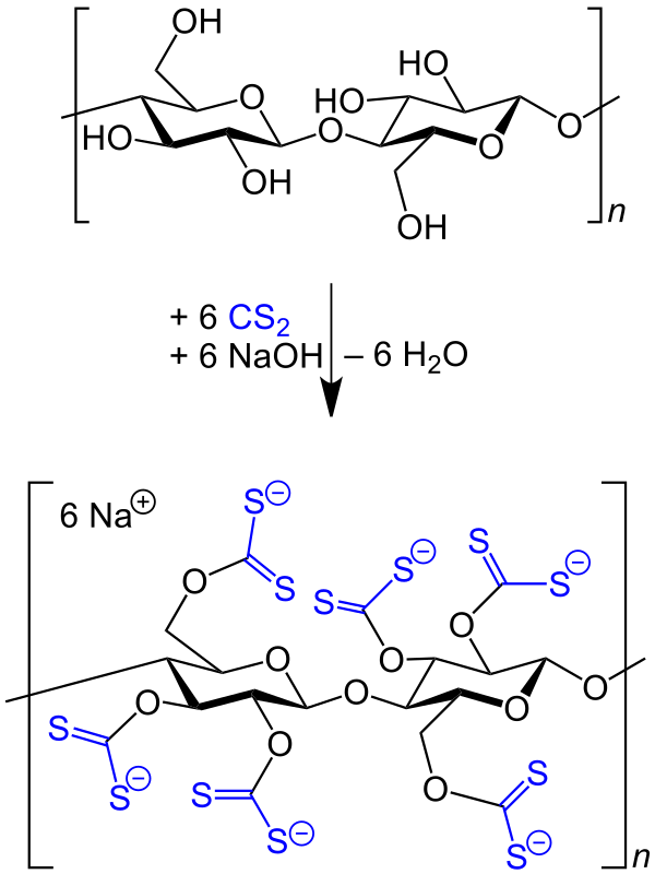 В процессе производства вискозы до 30 % используемого CS2 расходуется на протекание побочных реакций, ведущих к образованию тиокарбоната натрия и продуктов его дальнейших реакций с кислородом воздуха: