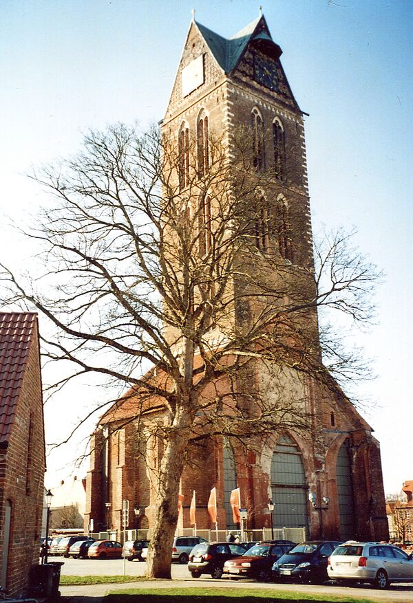 Висмарская церковь Девы Марии до войны принадлежала к числу самых крупных северогерманских церквей в стиле кирпичной готики. Её архитектор, Иоганн Грот, взял за образец трёхнефную базилику церкви Марии в Любеке. В апреле 1945 во время бомбардировки основное здание было сильно повреждено. Руины были окончательно взорваны в 1960 году. От церкви осталась лишь высокая башня (81 м), на которой висят 9 колоколов XVI—XVII веков. Здесь же в 1647 году установлены часы с циферблатом размером 5×5 м, которые четыре раза в день исполняют один из 20 хоралов.