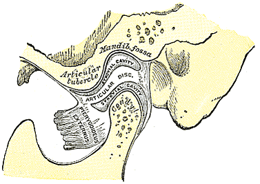 Височно-нижнечелюстной сустав является комбинированным суставом, представляющим функциональное сочетание двух анатомически отдельных блоковых суставов (левого и правого). Сочленяющиеся поверхности головки нижней челюсти (лат. cáput mandibuláre) и суставной бугорок (лат. tuberculum articulare) височной кости дополнены расположенным между ними волокнистым внутрисуставным хрящом (лат. díscus articuláris), который прирастая краями к суставной капсуле, разделяет суставную полость на два обособленных отдела. Оба височно-нижнечелюстных сустава функционируют одновременно, представляя собой единое комбинированное сочленение. Височно-нижнечелюстной сустав по строению хоть и относится к мыщелковым (скорее — к эллипсовидным), но благодаря наличию внутрисуставного хрящевого диска в нём возможны движения в трёх направлениях[2]:
