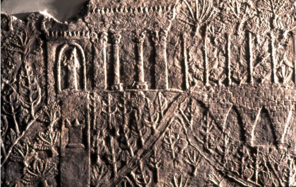 Сад царя Синаххериба был известен не только своей красотой, но и высоким уровнем гидротехники, которая обслуживала сад[39]. В Ассирии сформировались свои каноны сооружения царского сада. Так, царь Ашшурнацирапал II (883—859 до н. э.) проложил канал сквозь горы. В царских садах высаживались фруктовые деревья, также различные источники упоминают сосны, кипарисы, можжевельник, миндальные деревья, финиковые деревья, чёрное дерево, розовое дерево, оливковое дерево, дуб, тамариск, грецкий орех, терпентинное дерево, ясень, пихту, гранат, грушу, айву, инжир и виноград. Орошение этого сада требовало улучшения водоснабжения города Ниневии в целом, в связи с чем была построена 80-километровая система каналов, уходившая в горы. Синнахериб подробно описывал в своих надписях используемые технологии и гидротехнические сооружения. В верховьях Бавиана (Хинниса)[40] в его надписи упоминаются автоматические шлюзы. Огромный акведук, пересекающий долину в Джерване, был построен из более чем 2 миллионов обработанных камней, использовались каменные арки и водостойкий цемент[41]. На акведуке имеется надпись: «Синаххериб, царь мира, царь Ассирии. На большом расстоянии у меня был водоток, направленный в окрестности Ниневии, соединяя вместе воды… По крутым долинам я протянул акведук из белых известняковых глыб и заставил эти воды течь по нему».