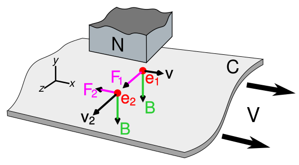 Свободные носители заряда (электроны) в металлическом листе движутся вместе с листом вправо, поэтому магнитное поле воздействует на них сбоку (сила Лоренца). Поскольку вектор скорости v зарядов направлен вправо, а магнитное поле B направлено вниз, из правила буравчика сила Лоренца на положительных зарядах F = q(v × B) направлена к задней части диаграммы (слева если смотреть в направлении движения v). Это вызывает ток I по направлению к задней части под магнитом, который вращается вне магнитного поля по часовой стрелке вправо и против часовой стрелки влево, снова к передней части магнита. Подвижные носители заряда в металле, электроны, имеют отрицательный заряд (q <0), поэтому их движение противоположно направлению показанного обычного тока.