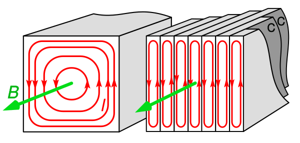 Вывод полезного уравнения для моделирования эффекта вихревых токов в материале начинается с дифференциалом, магнитостатической формой закона Ампера[4], обеспечивая выражение для намагничивающего поля Н окружающей плотности тока J: