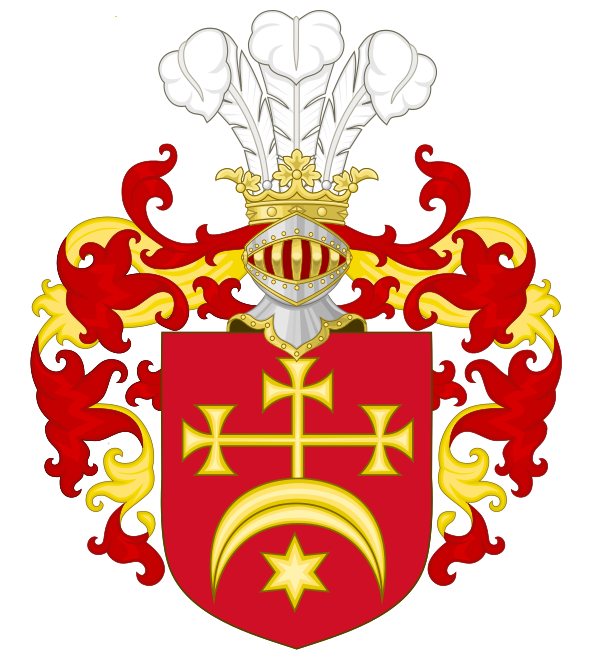 Описание герба: В поле червлёном золотой полумесяц, рогами вниз обращённый. Под ним золотая звезда о шести концах, а над полумесяцем крест с концами перекрещенными. Над гербом княжеская митра подбитая мантией горностаевой. |