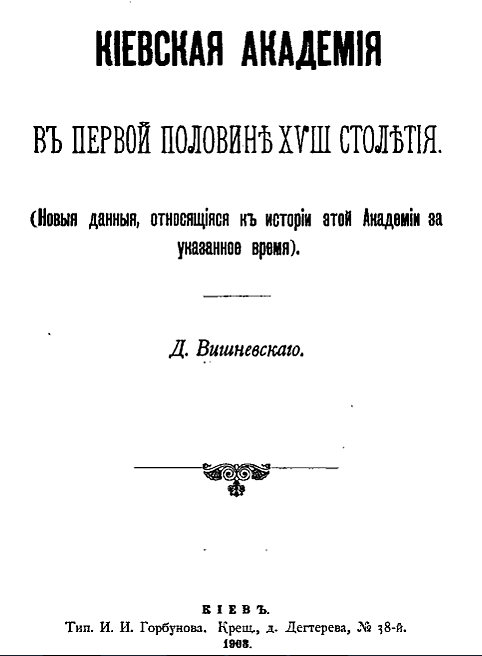 - Киевская академия в первой половине XVIII столетия. Тип. И. И. Горбунова, 1903.