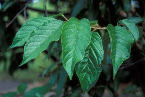 Листья в очертании яйцевидные, обратнояйцевидные или эллиптические, с дважды- или, реже, единожды-зубчатым краем, 7—12 см длиной и 3,5—5 см шириной, голые.