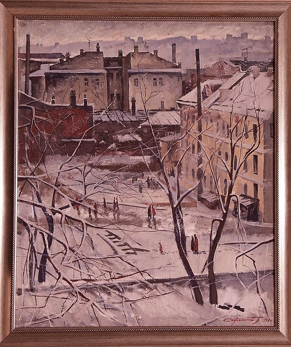 На полотне представлен зимний городской индустриальный пейзаж, изображённый с высоты. На первом плане располагается двор с деревьями и прохожими, справа выделяется жёлтый дом с заснеженной крышей. На втором плане показано производственное здание с высокими чёрными трубами, за которым возвышается зеленовато-серый дом. Композиция построена таким образом, что зритель может проследить смену архитектурных элементов от жилых до промышленных построек. Серое небо и преобладание холодных оттенков в цветовой гамме усиливают ощущение зимней атмосферы.