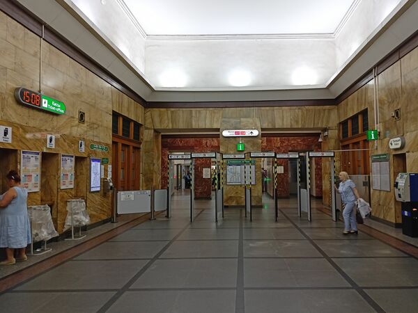 Наклонный ход (выход со станции), содержащий три эскалатора, расположен в северном торце станции. С 15 ноября 1955 по 9 августа 2006 года в наклонном ходе эксплуатировались эскалаторы типа ЭМ-5 с высотой подъёма ≈ 50 метров. С 10 августа 2006 по 15 февраля 2008 года велась реконструкция наклонного хода с заменой эскалаторов. С 16 февраля 2008 года эксплуатируются эскалаторы типа Е-55Т. За основу проекта вестибюля станции была взята дипломная работа выпускника ЛИИЖТа Алексея Бобра.