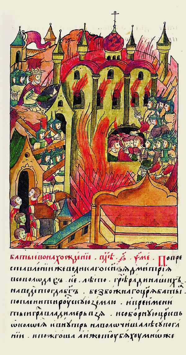 яко свѣрпъıи звѣрь не пощади оуности его, велѣ предъ собою зарѣзати и градъ вѣсь избье, епископоу же преподобномоу во цѣрквь оубѣгшоу со княгинею и с дѣтми и повѣлѣ нечѣстивыи огнемь зажещи[8].