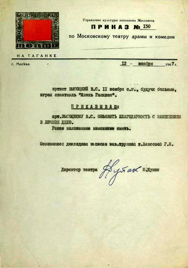 Творческая биография Высоцкого вмещала в себя не только удачи, но и эпизоды, которые в театре порой разрешались весьма строго, вплоть до увольнения. Впервые уход Высоцкого из «таганской» труппы произошёл в марте 1968 года. Согласно приказу, подписанному директором Николаем Дупаком, артист был освобождён от работы по статье 47 «Г» КЗоТ[комм. 15] с формулировкой «за вопиющее нарушение трудовой дисциплины». Увольнению предшествовали отмена спектакля «Жизнь Галилея», недопуск на репетицию постановки «Живой» и невыход на представление «Десять дней, которые потрясли мир»[237][238]. Через две с половиной недели, в апреле, благодаря решению месткома Высоцкий вернулся в театр «временно-условно», по договору и с пониженным окладом[239].