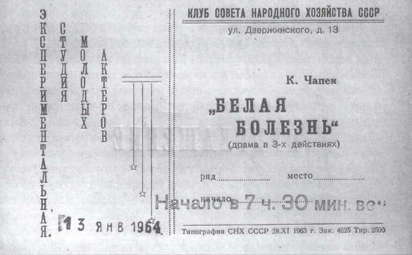 В числе коллективов, с которыми Высоцкий сотрудничал в начале творческой карьеры, была также самодеятельная экспериментальная театральная студия при клубе МВД. У её истоков стояли товарищи Владимира Семёновича — Геннадий Ялович и Евгений Радомысленский. Высоцкий, пришедший туда в 1963 году, получил роль отца в спектакле «Белая болезнь» по пьесе Карела Чапека, однако из-за постоянных отъездов и участия в киносъёмках репетировал бессистемно, иногда надолго исчезал, — в результате премьера состоялась без него. Образ отца при выпуске «Белой болезни» воплотил на сцене основной исполнитель этой роли — Геннадий Ялович; Владимир Семёнович играл в спектакле всего «один или два раза». При этом, по свидетельству Радомысленского, именно в студийную пору зарождался актёрский почерк Высоцкого, формировались «жёсткость игры, нерв»[32][33].
