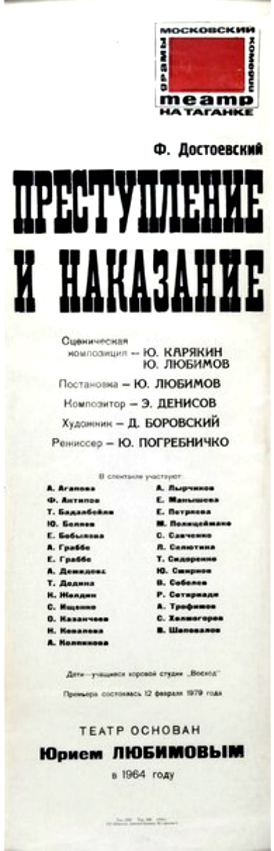 В конце 1970-х годов Высоцкий, занятый киносъёмками, концертной деятельностью, литературным творчеством, стал постепенно отдаляться от театра. Последней его сценической ролью стал Аркадий Свидригайлов в спектакле «Преступление и наказание»[комм. 13], премьера которого состоялась 12 февраля 1979 года[170][171]. Современники по-разному оценивали работу актёра над этой ролью. Валерий Золотухин писал, что Высоцкий во время первой же репетиции взял «хороший тон»[136]. Алла Демидова утверждала, что репетировал он без особого энтузиазма, хотя сыграл в итоге ярко и мощно[171]. Герой Достоевского стал причиной серьёзной размолвки между Владимиром Семёновичем и его давним товарищем Иваном Дыховичным, которому режиссёр поручил работать в спектакле в качестве дублёра Высоцкого[172]. Ряд элементов постановки (например, гитара в руках у персонажа) вызвал претензии со стороны критиков. В то же время Любимов назвал роль Свидригайлова лучшей в театральной биографии Высоцкого, поставив её даже выше Гамлета[173][174].