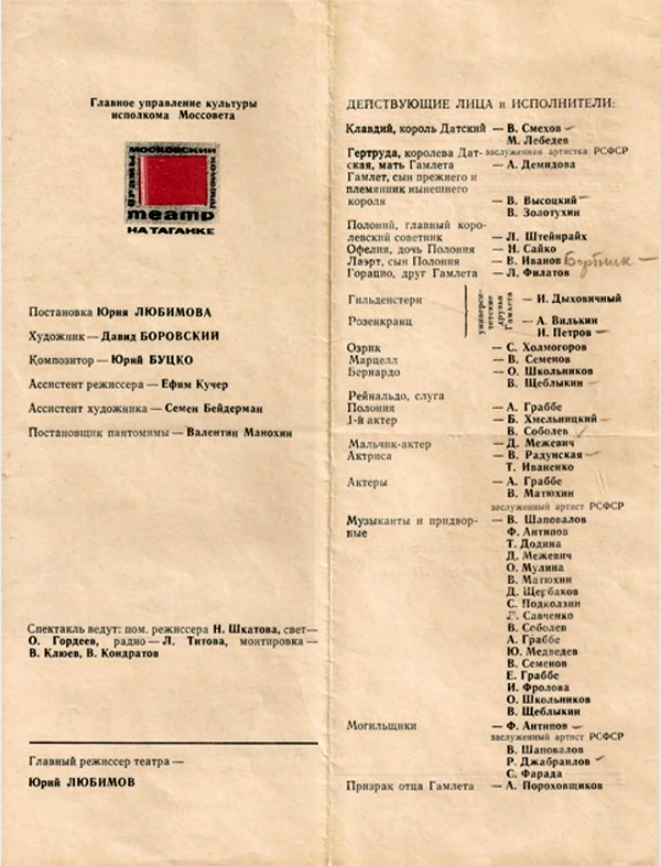 Начало работы над «Гамлетом» было тяжёлым. Первая репетиция состоялась 11 января 1971 года. Затем возникла пауза, связанная со срывом и госпитализацией исполнителя главной роли; своё 33-летие, отмечавшееся 25 января, Высоцкий встретил в больнице имени Кащенко. За время его отсутствия Любимов предложил поработать над ролью принца датского Леониду Филатову, Дальвину Щербакову, Валерию Золотухину[126]. Высоцкий, вернувшись в театр в конце месяца и получив строгие предупреждения по линии месткома и других инстанций, принёс извинения и в то же время заявил, что если у него появятся дублёры, он от участия в спектакле откажется[127].