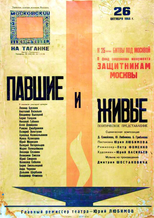 Следующим после «Антимиров» поэтическим спектаклем Театра на Таганке стали «Павшие и живые»[комм. 6]. Идея принадлежала Константину Симонову, он же пригласил соавторов: Давида Самойлова, Юрия Левитанского, Бориса Грибанова. Сценическая композиция в постановке Любимова и художественном оформлении Юрия Васильева была основана на стихах поэтов военного времени и песнях Михаила Анчарова, Владимира Высоцкого, Павла Когана, Юрия Левитанского, Сергея Крылова, Булата Окуджавы, Галины Шерговой[54][56].