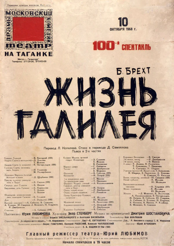 Приступив в 1966 году к работе над спектаклем «Жизнь Галилея»[комм. 7] по пьесе Брехта, Любимов не сразу определился с выбором исполнителя главной роли. Вначале к репетициям был привлечён Николай Губенко, позже — Александр Калягин[70]. Галилей, по режиссёрскому замыслу, должен был прожить свою сценическую историю в развитии, пройдя разные стадии — от гениальных прорывов до запоздалого раскаяния. В итоге выбор пал на двадцативосьмилетнего Владимира Высоцкого, находившегося в ту пору на этапе «энергичного становления». Режиссёра не смущало внешнее и возрастное несоответствие актёра и героя (в финале постановки Галилей был уже стариком) — ему казалось более важным умение исполнителя воплотить брехтовские «интеллектуальные задачки» об истине, о предательстве собственной идеи[71].