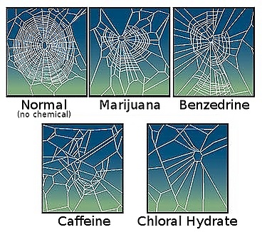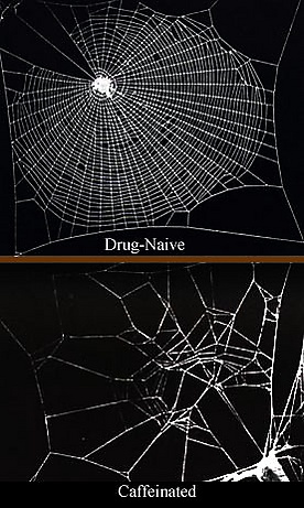 В 1948 году швейцарский фармаколог Петер Н. Витт начал свои исследования воздействия наркотических и психоактивных веществ на пауков[4]. Витт протестировал на пауках с целый ряд психоактивных веществ и обнаружил, что они влияют на размер и форму паутины. При малых дозах кофеина (10 мкг/паук) паутина была меньше; радиусы были неравномерными, но закономерность кругов не изменялась. При более высоких дозах (100 мкг/паук) форма менялась сильнее, а рисунок паутины становился неправильным. Все протестированные наркотики, в свою очередь, снижали закономерность паутины[5].