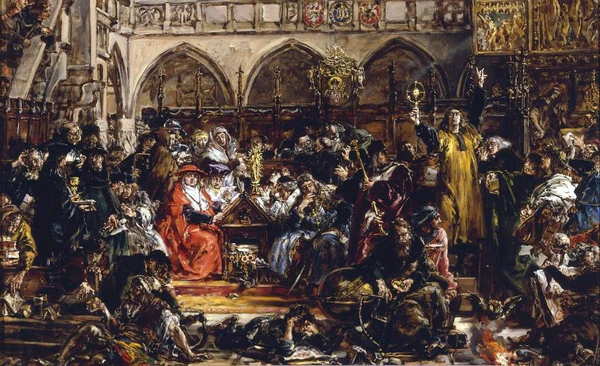 Многофигурная работа, изображающие разные слои польского общества: духовенство и преподавателей университетов в готическом интерьере.