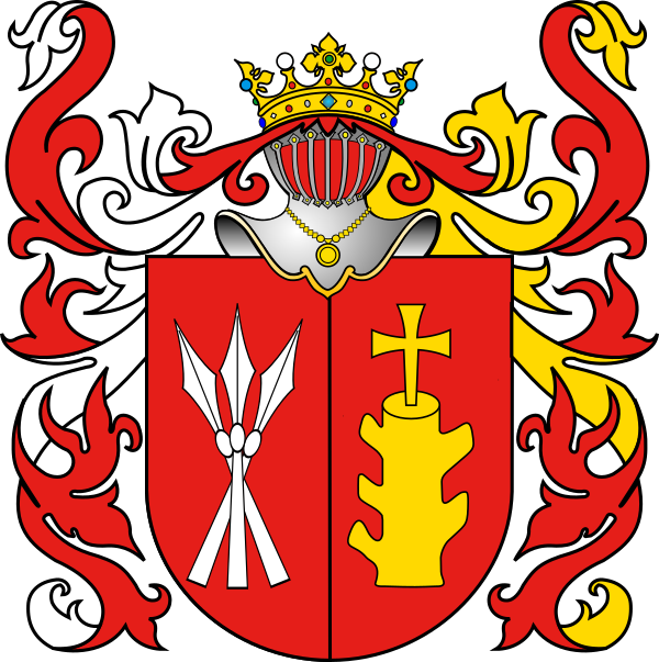 Щит червлёный, рассечен. В правом поле три серебряных копейных острия в звезду; в левом поле золотой срубленный пень с пятью сучьями: с правой стороны тремя, а с левой двумя, и на нём крест.
