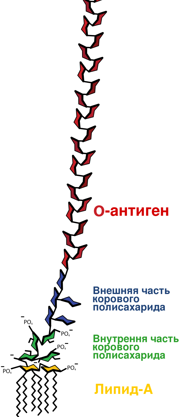 - полисахаридной наружной цепи, состоящей из повторяющихся олигосахаридных звеньев (антигена O), каждое из которых состоит из 2—8 молекул гексоз[2].