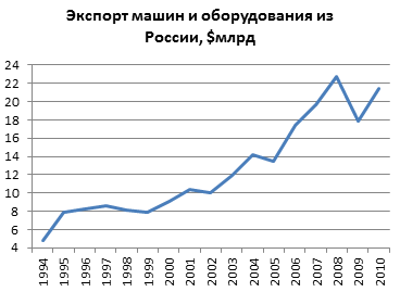 В 2014 году из России было экспортировано машин и оборудования на $17,9 млрд, в том числе в страны за пределами СНГ — $11,8 млрд, в страны СНГ — $6,1 млрд[47]. С 1999 по 2009 год суммарный экспорт машин и оборудования из России увеличился в 2,3 раза, их экспорт в страны за пределами СНГ — 2 раза, в страны СНГ — в 3,2 раза[47].