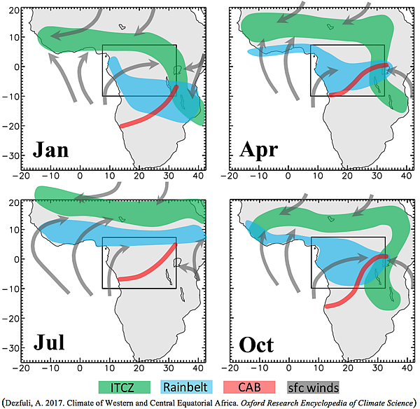 ITCZ обычно определяется как экваториальная зона, где сходятся пассатные ветры. Сезонность осадков традиционно связывают с северо-южной миграцией ITCZ, которая следует за солнцем. Хотя это в основном справедливо для экваториальных океанов, ITCZ и область максимальных осадков могут быть разделены над континентами[6][7]. Экваториальные осадки над сушей не являются просто реакцией на приземную конвергенцию. Скорее, они модулируются рядом региональных факторов, таких как локальные атмосферные струи и волны, близость к океанам, конвективные системы, вызванные рельефом, рециркуляция влаги, а также пространственно-временная изменчивость растительного покрова и альбедо[6][8][9].