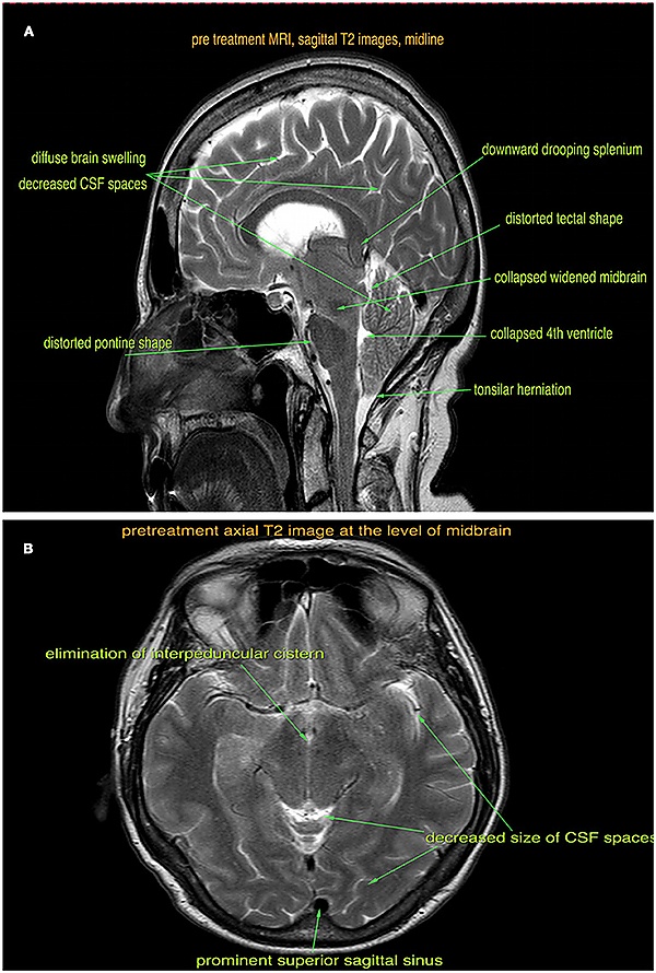 Магнитно-резонансная томография. В ходе исследования выявляют утолщение мозговых оболочек, опущение миндалин мозжечка в большое затылочное отверстие, скопление ликвора в субдуральном пространстве головного мозга, увеличение размеров гипофиза, мамиллопонтинное расстояние менее 5,5 мм и понтомезенцефалический угол менее 50 °[3], каллозальный угол менее 90 °[6].