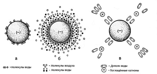- Максимально-гигроскопическая влага адсорбируется почвой из атмосферы с относительной влажностью 95-100 %. При отрицательных температурах максимальная гигроскопическая влажность незасоленной почвы совпадает с процентным содержанием незамёрзшей воды в целом[6]. Адсорбционная способность частиц почвы зависит от их величины, формы и химического состава, причём даже на одной частице мощность слоя влаги может быть различной в зависимости от формы поверхности. При этом часть паров конденсируется на вогнутых участках, в результате чего суммарное количество воды имеет двойную природу, складываясь из адсорбированной и капиллярно-конденсированной влаги.