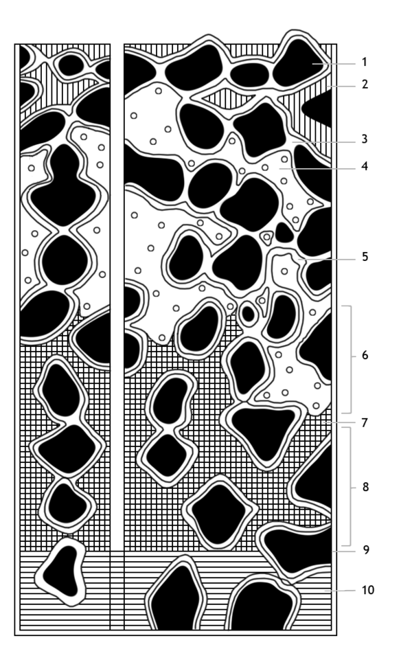 - Плёночная (молекулярная) влага — дополнительная влага, адсорбируемая почвой из жидкой фазы поверх слоя максимально-гигроскопической. С частицами почвы связана слабее, чем последняя, причём рыхлость возрастает от внутренних слоёв ко внешним. По этой причине плёночная влага, хотя слабо, но усваивается растениями. Передвигается она под влиянием градиентов напора воды, температуры и влажности почвы, а также осмоса, её скорость же ограничивается десятками сантиметров в год[5].