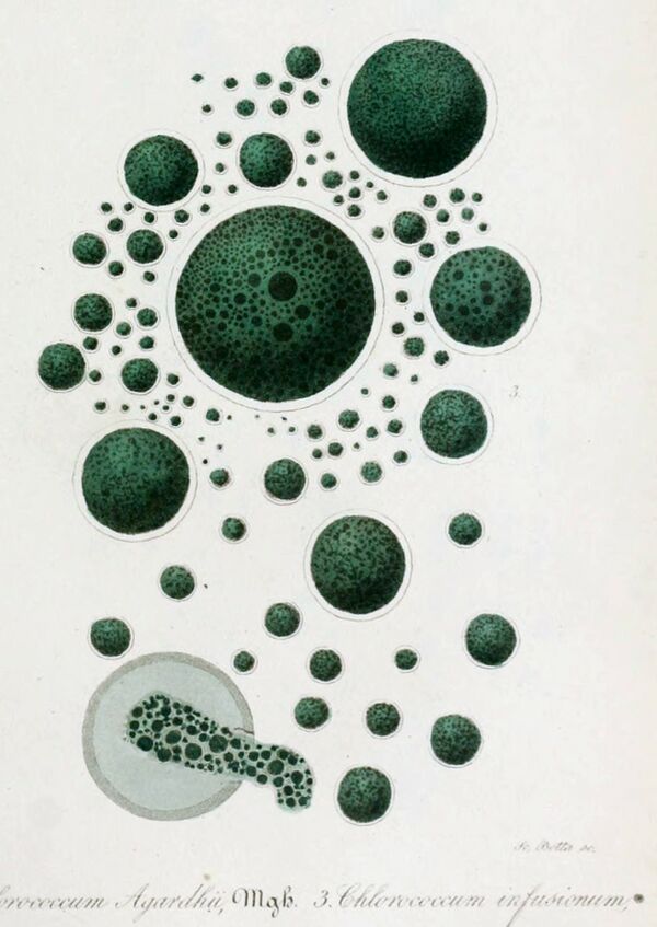 К водорослям, развивающимся на поверхности снега и льда (криофильные водоросли), относится более 100 видов, из которых подавляющее большинство — зелёные, встречаются также синезелёные, жёлто-зелёные, диатомовые и др.[4] Водоросли могут вызывать «цветение» снега, окраска которого при этом может быть зелёной, жёлтой, голубой, бурой и даже чёрной, — в зависимости от преобладания в нём тех или иных видов снежных водорослей и других организмов. Главным организмом, вызывающим окраску снега, является хламидомонада снежная. Бо́льшую часть времени эта водоросль находится в состоянии неподвижных шаровидных клеточек, густозаполненных красным пигментом гематохромом, но при оттаивании верхних слоёв снега она начинает очень быстро размножаться, образуя неподвижные мелкие клетки и типичные подвижные хламидомонады[11].